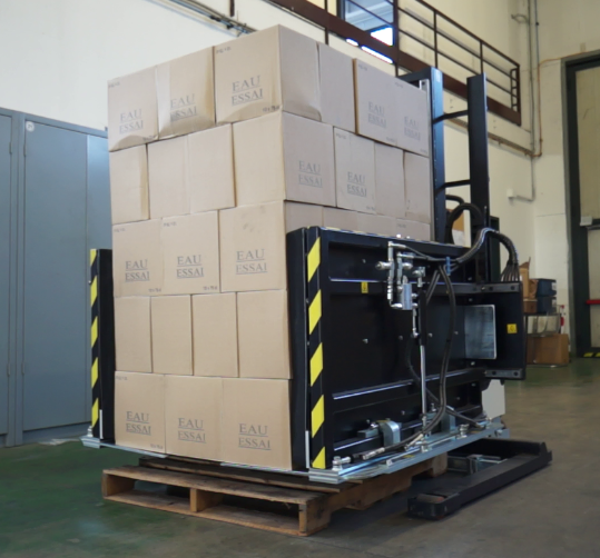 - Desztaplarka klamruje/ delikatnie zaciska produkt od strony dwóch dłuższych boków i lekko unosi go z palety,