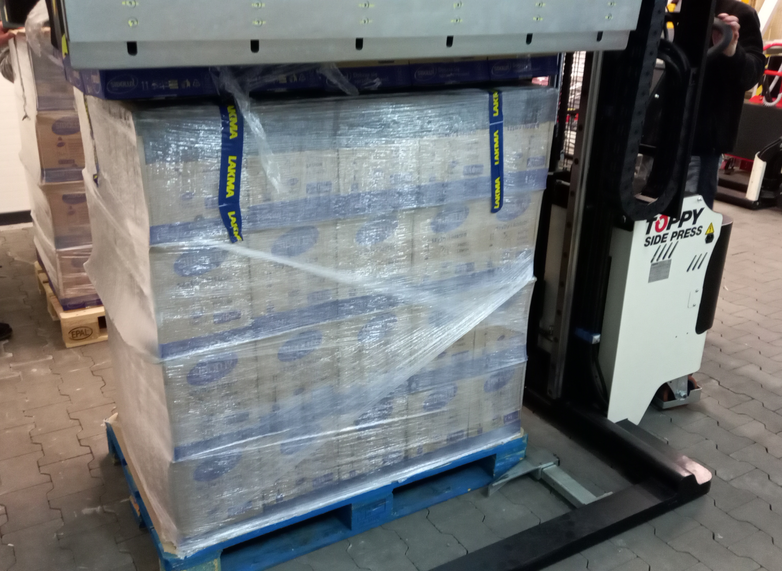 - Zmieniarka klamruje/ delikatnie zaciska produkt od strony dwóch dłuższych boków i lekko unosi go z palety