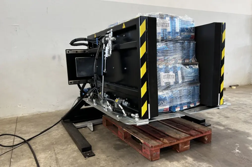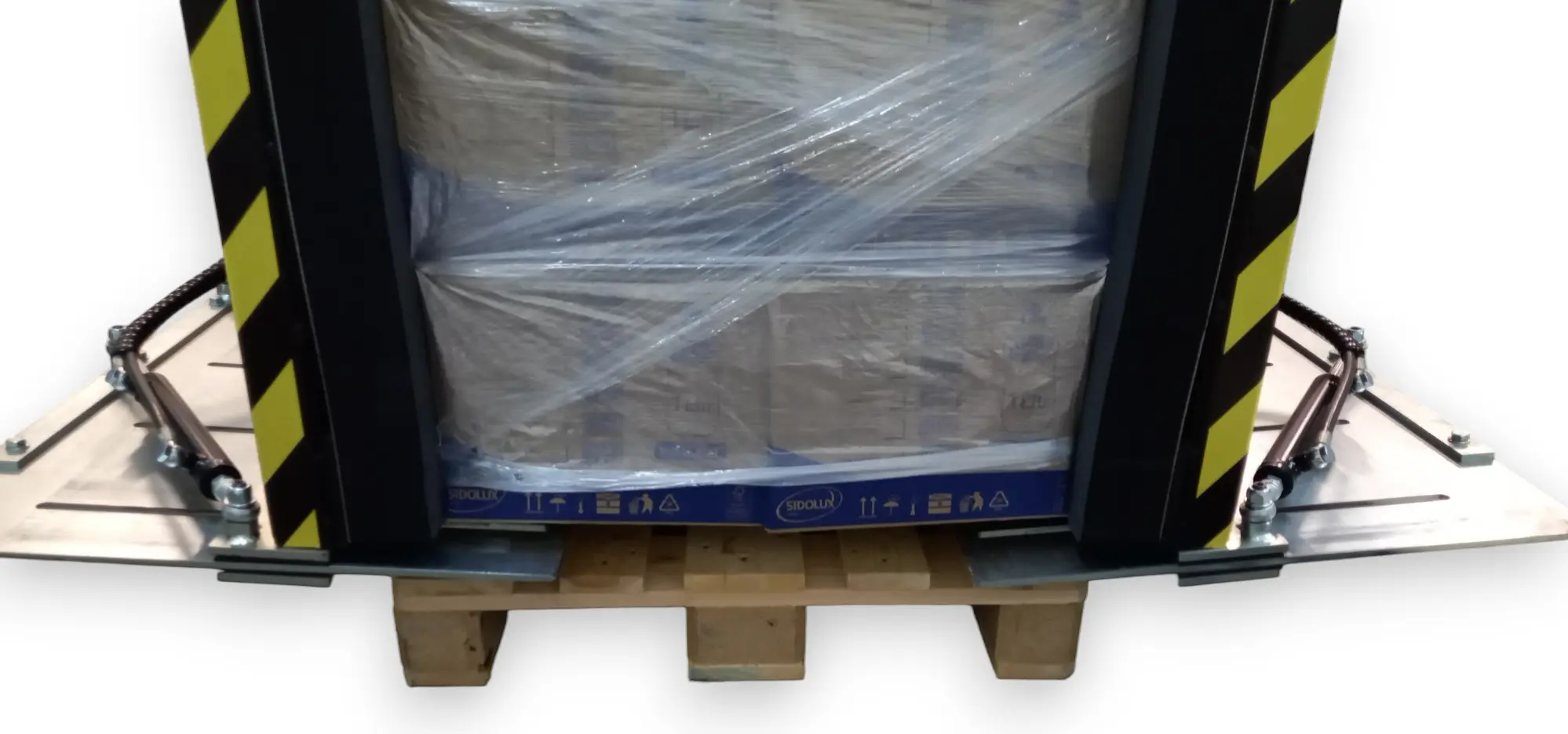 - Dodatkowo, aby zapewnić stabilne podparcie ładunku, maszyna wykorzystuje dwa wysuwane „ostrza/skrzydła stalowe”, które wsuwają się pomiędzy najniższą warstwą produktu a paletą.