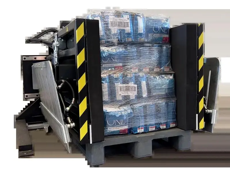 - Gdy paleta jest podmieniona – towar jest opuszczany na docelowy nośnik; blachy zostają schowane a płyty boczne rozsunięte od ładunku i można odebrać gotowy produkt na podmienionej palecie zewnętrznym wózkiem paletowym.