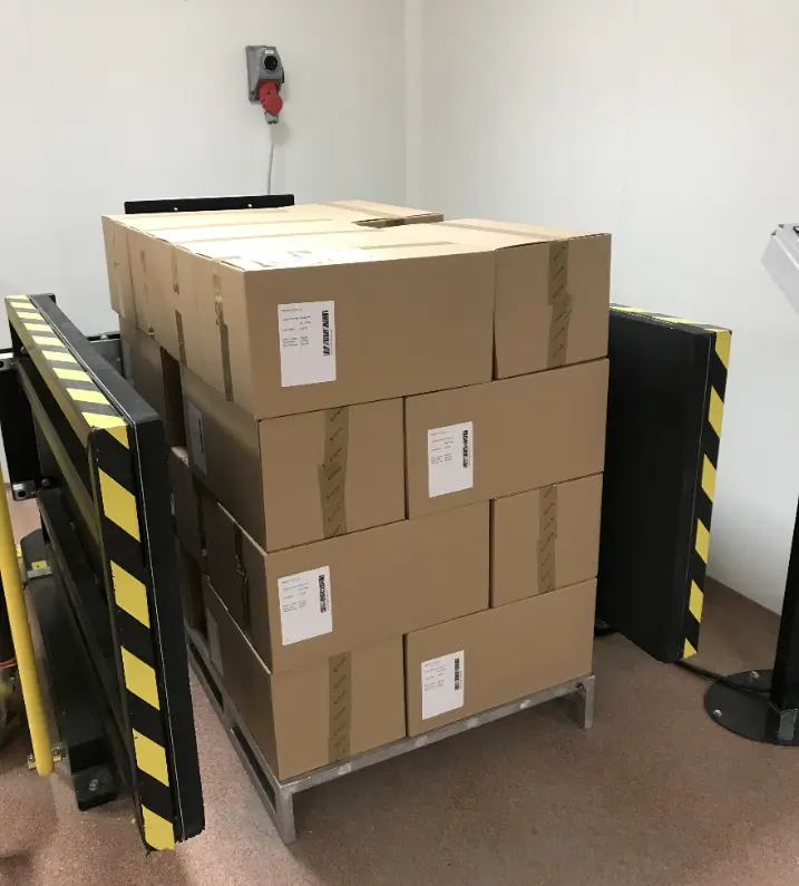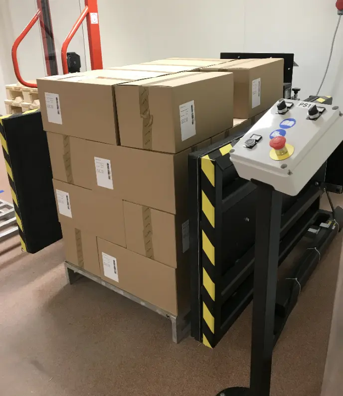 - Gdy paleta jest podmieniona – towar jest opuszczany na docelowy nośnik; płyty boczne rozsunięte od ładunku i można odebrać gotowy produkt na podmienionej palecie zewnętrznym wózkiem paletowym (ręcznym lub elektrycznym).