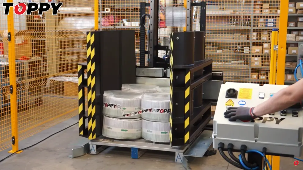 Zmieniarka do palet Toppy Side press Fixed to zaawansowany technologicznie, w pełni zautomatyzowany wymiennik paletowy, zaprojektowany z myślą o sprawnej i bezpiecznej zamianie palet pod różnego rodzaju ładunkami. Urządzenie skutecznie eliminuje ręczne, czasochłonne metody, zastępując je nowoczesnym systemem, który zapewnia precyzję, powtarzalność oraz pełną kontrolę nad procesem podmiany palet. Tego typu rozwiązania coraz częściej stanowią podstawowe wyposażenie nowoczesnych magazynów, centrów dystrybucyjnych oraz zakładów produkcyjnych.
