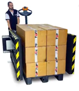 - Zewnętrzny wózek unoszący wkłada towar pomiędzy płyty boczne zmieniarki palet,