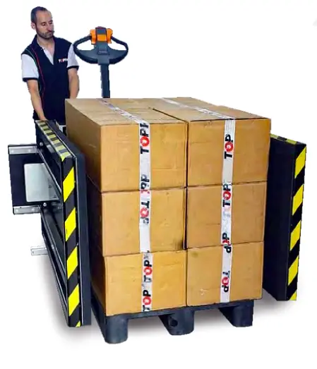 Podmieniarka Toppy Side Press Fixed to stacjonarna zmieniarka do palet firmy Toppy, stworzona do podmiany palet przy niestabilnych i delikatnych ładunkach takich jak warstwowo ułożone fiolki, kartony, jogurty itd. Posiada regulowane ciśnienie chwytu, delikatnie unosi ładunek i umożliwia łatwą wymianę palety. Ta stacjonarna podmieniarka do palet z bocznymi płytami dociskowymi jest urządzeniem, które za pomocą dwóch bocznych płyt ściska towar na palecie i podnosi go, a następnie umożliwia swobodną wymianę pustej palety pierwotnej na docelową. Podczas gdy boczne płyty ściskające trzymają ładunek „w powietrzu” – możliwa jest podmiana palety. Jest to uproszczona wersja stacjonarnej zmieniarki do palet Toppy Side press Fixed (odnośnik do podstrony 1A8), która dodatkowo posiada wysuwane blachy od dołu, na których dodatkowo spoczywa towar.