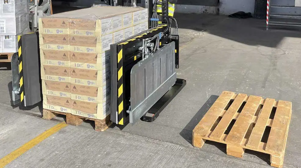 - Zmieniarko sztaplarka delikatnie zaciska produkt od strony dwóch dłuższych boków i lekko unosi go z palety,
